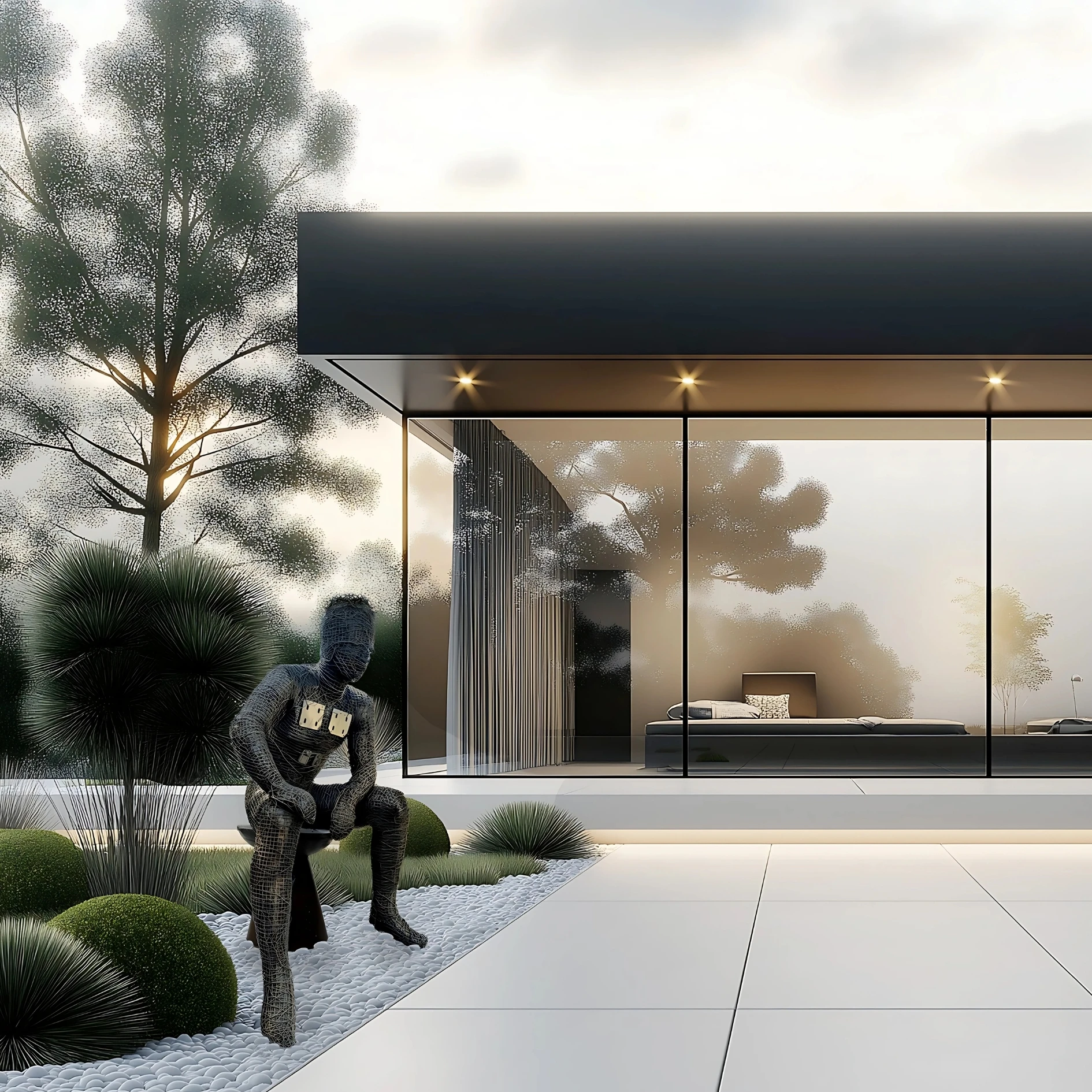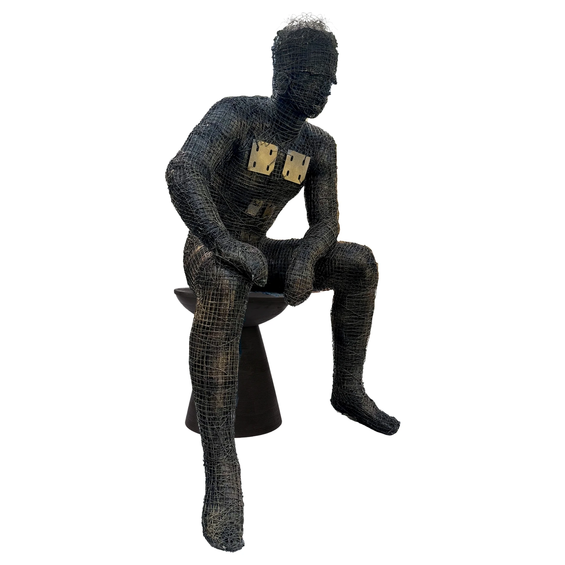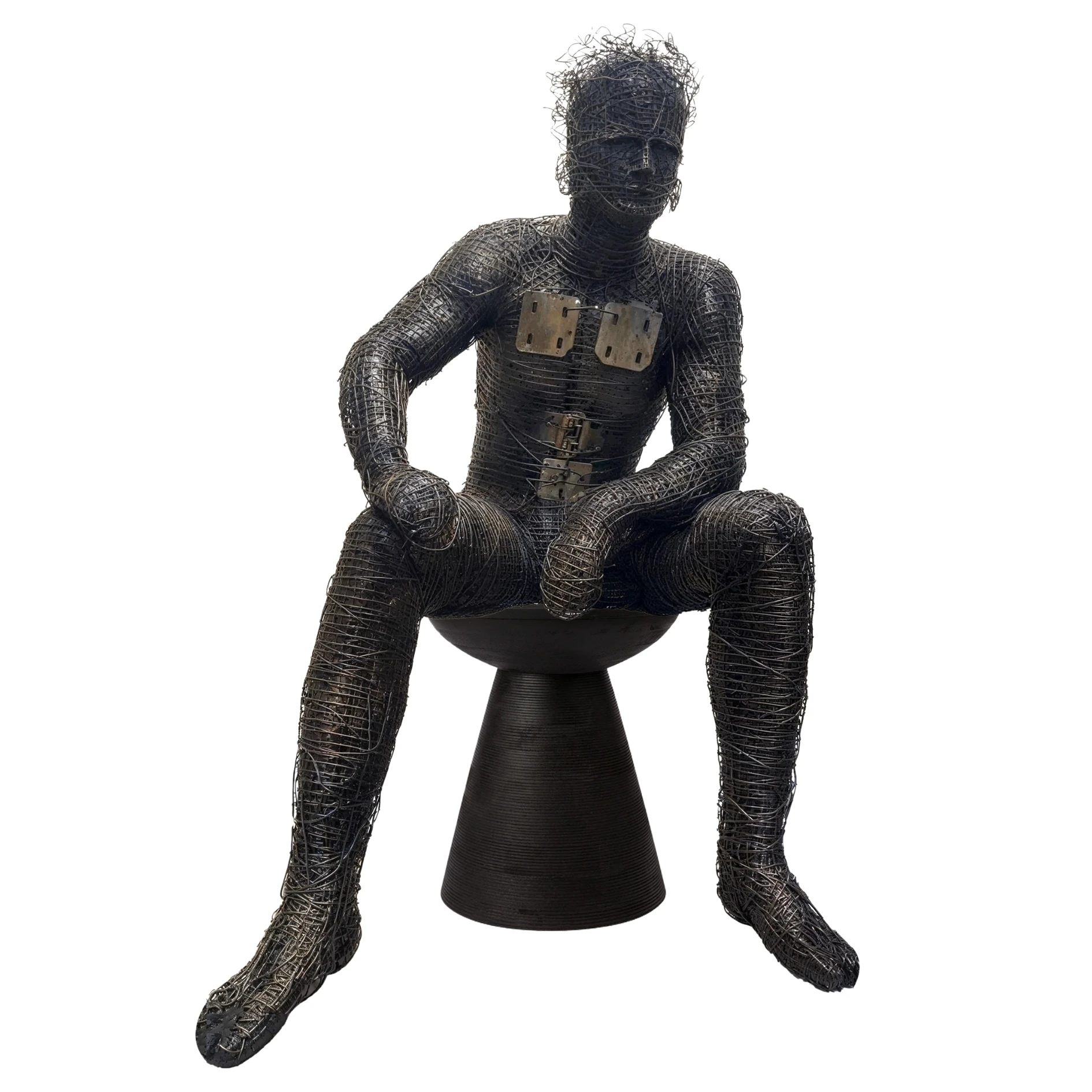 Futuristic life-sized humanoid sculpture. Orion symbolizes strength, intelligence, and futuristic vision. This life-sized figure, made from fiberglass, metal mesh, and woven industrial wires, blends organic and mechanical elements, showcasing confidence and resilience. As a warrior and thinker, Orion embodies transformation and limitless potential, inspiring viewers to embrace ambition and explore uncharted possibilities.