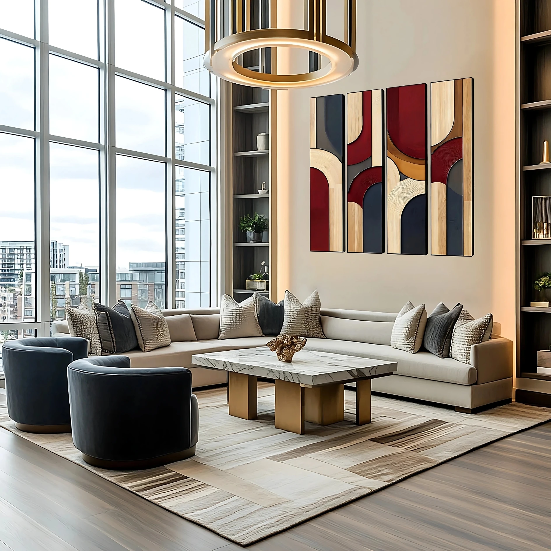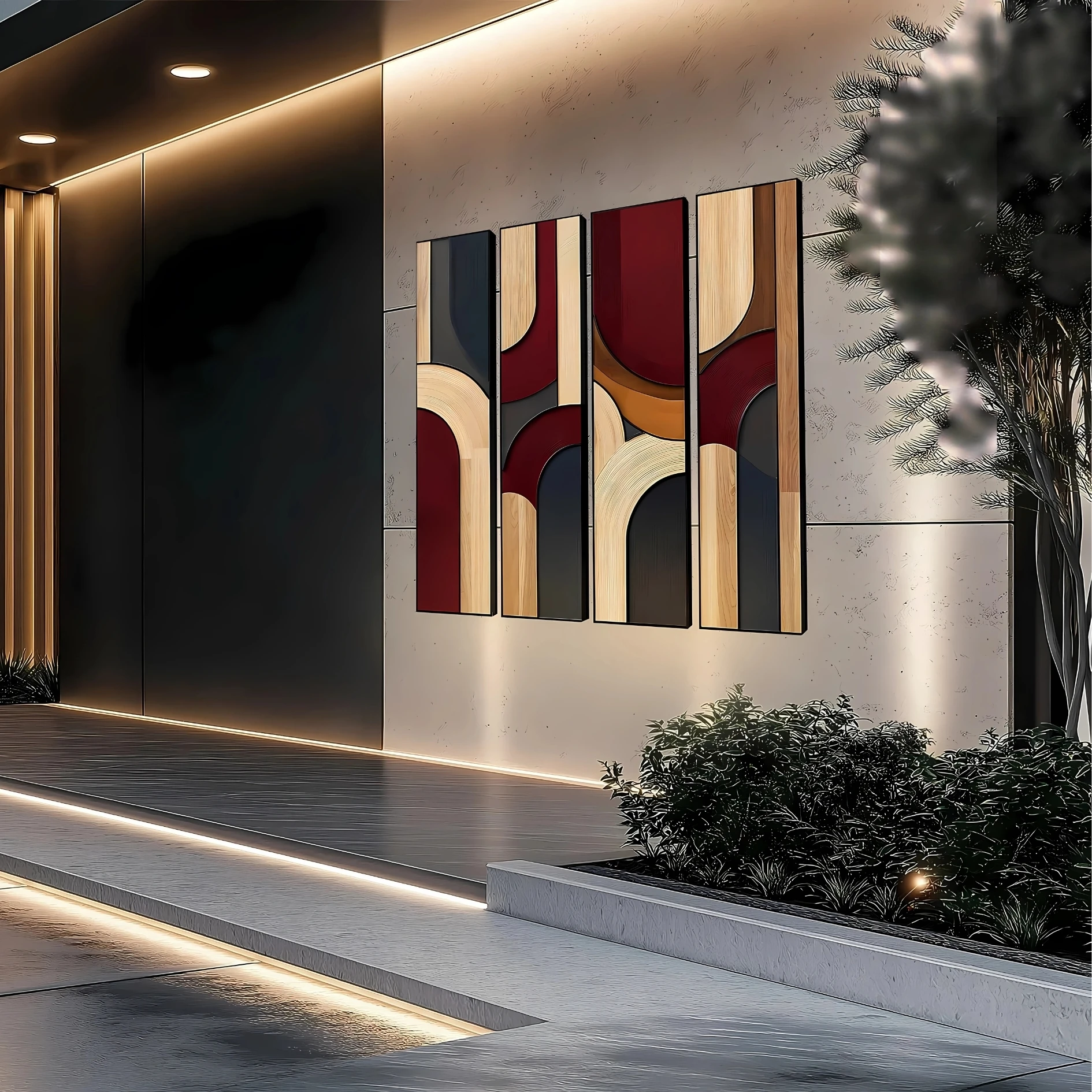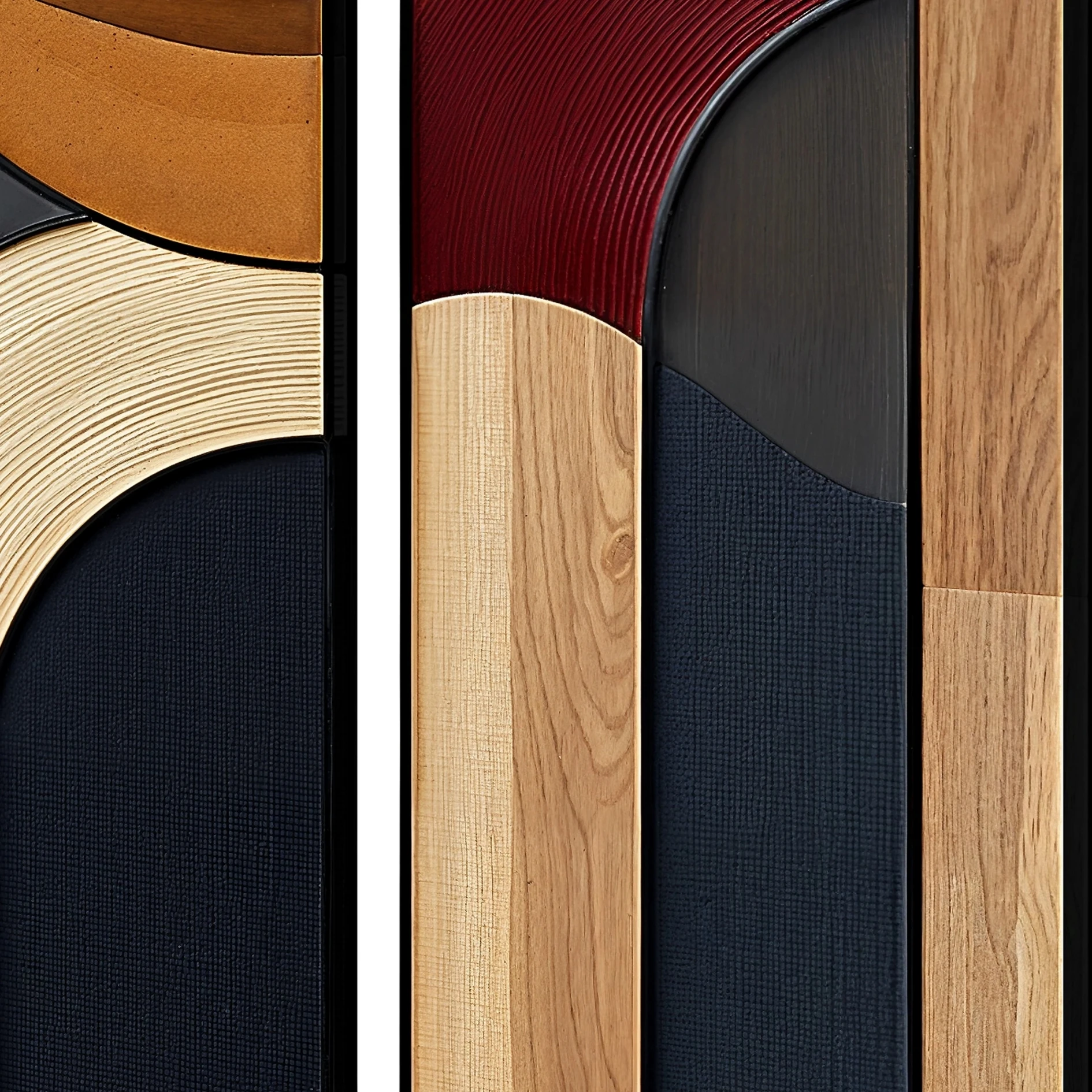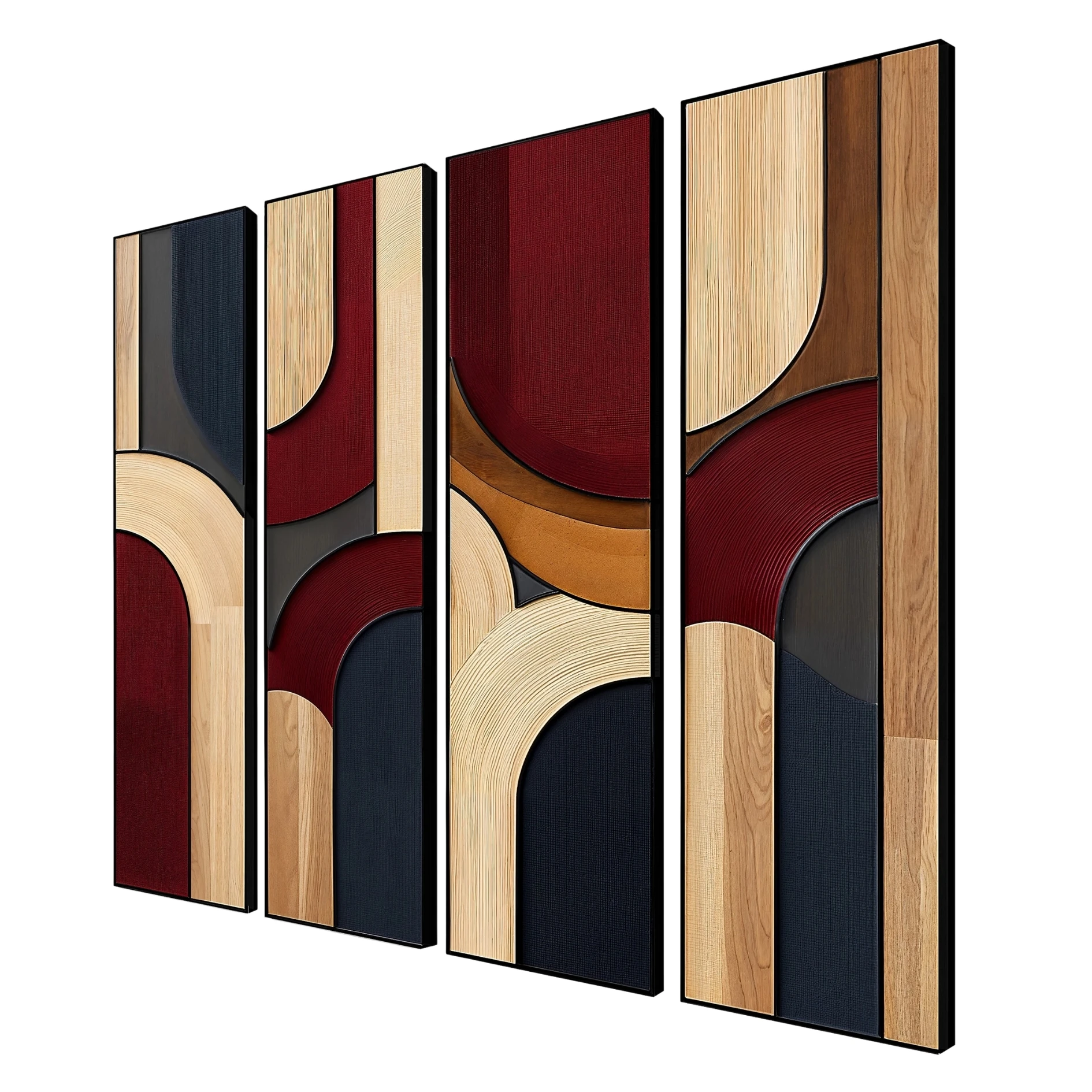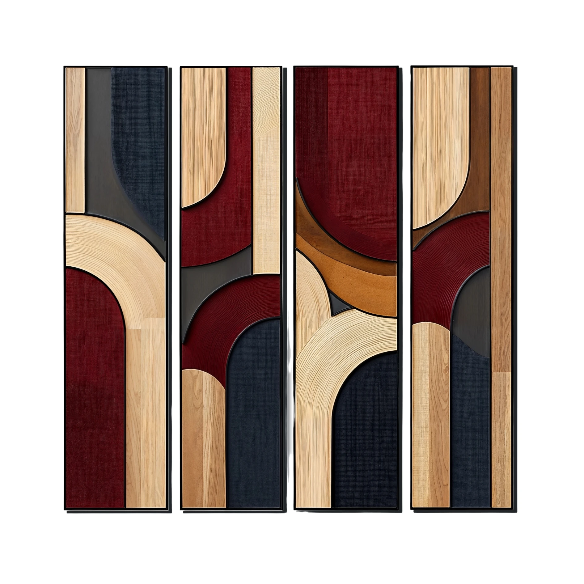 Four-panel composition of abstract curves. This four-panel artwork showcases a captivating dance of geometric forms and textures. Bold arcs and clean lines interweave with natural wood grains, rich burgundy tones, deep navy hues, and golden brown accents. The composition creates a sense of movement, as though the curves flow effortlessly from one panel to the next. Each piece combines a modern aesthetic with a warm, earthy palette, striking a perfect balance between elegance and complexity. "Symphony of Curves" invites viewers to explore the harmony of shapes, textures, and colors in a timeless, abstract form.